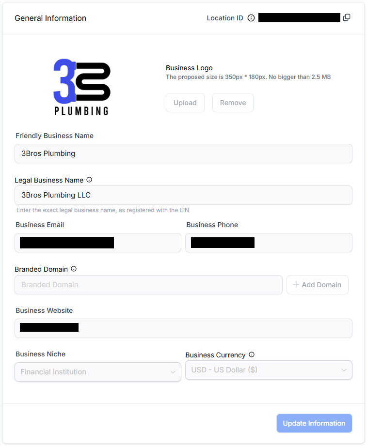 The Business Profile Settings page is where you manage your business information and account-level profile settings.